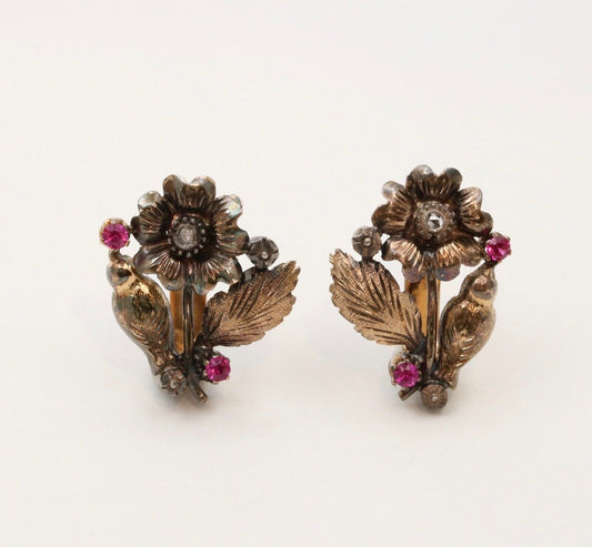 14k Yellow Gold Antique Style Rose Cut Diamond and Synthetic Ruby Huggie Earrings