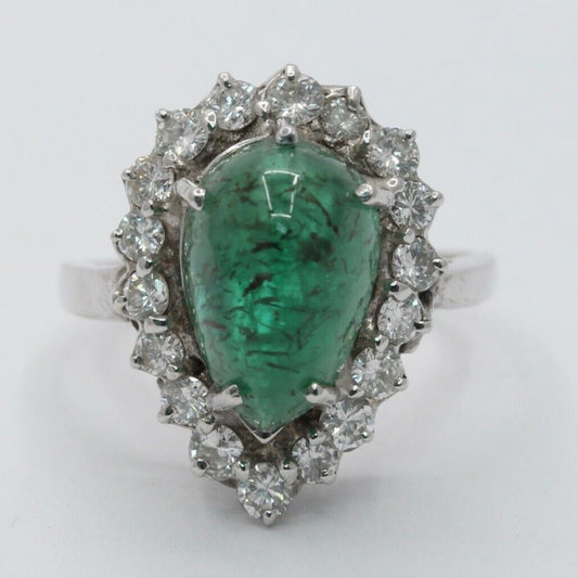 14K White Gold Cabochon Emerald Diamond Engagement Ring Alternative