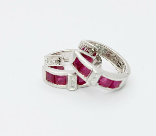 18K White Gold Diamond, Natural Ruby Huggie Earrings