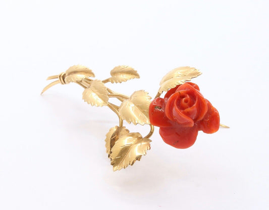 A Beautiful Vintage Rose Designed 18K Yellow Gold Carved Coral Brooch Pin